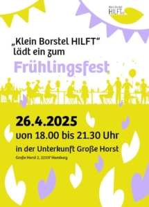 Mitzubringen braucht ihr nichts außer guter Laune, wir kümmern uns um Speis & Trank. Wir freuen uns auf euch! (Sagt bitte unter info@klein-borstel-hilft.de Bescheid, ob ihr kommt – damit wir genug zu essen und zu trinken besorgen können.)